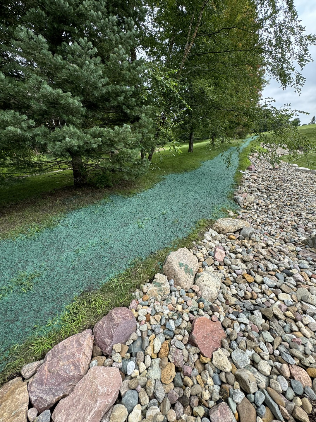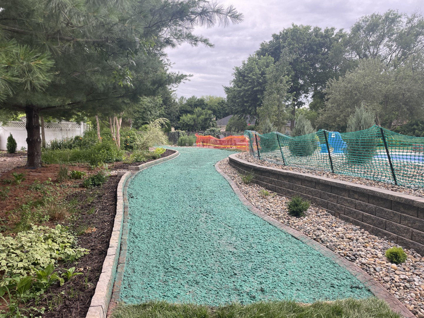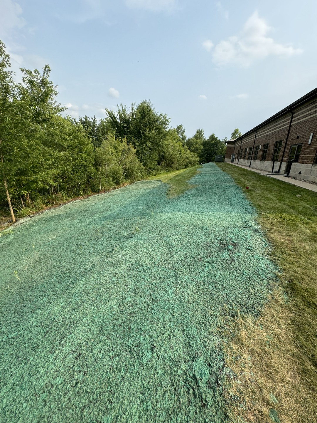 Keep the mulch consistently moist for the first 2–3 weeks. Use short, light watering cycles 2–3 times per day, depending on weather conditions and shade. As the grass reaches mowing height, transition to deeper, less frequent watering to encourage stronger root development.